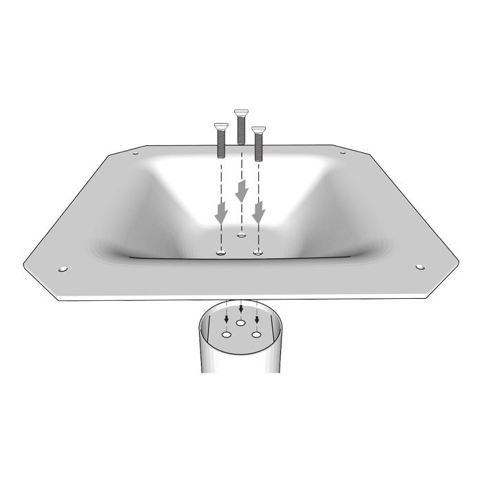 Step 3. Align the 3 holes in the cylindrical upright with the holes in the top plate until it sits square with the base legs. Fasten the top place using the M8 Allen bolts using a 8mm Allen key. 3x fittings are located to both ends of the cylindrical upright. Please ensure all bolts are threaded correctly before tightening, to avoid misalignment.