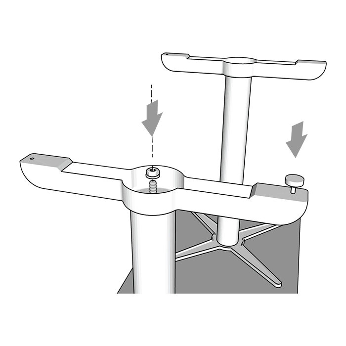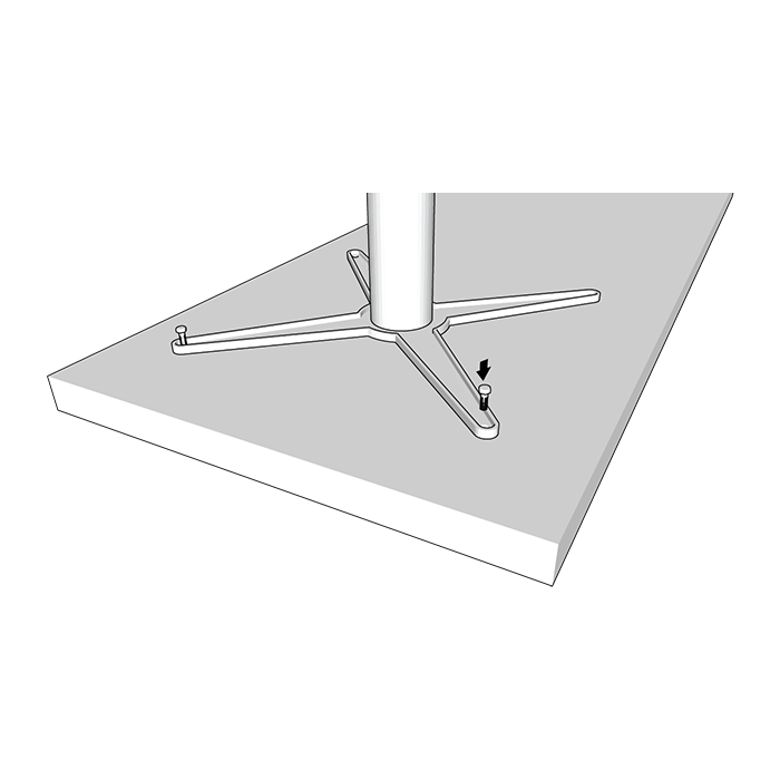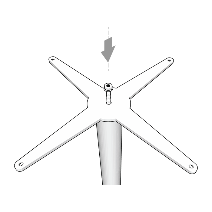 Step 4. Fasten the pedestal base to the other end of the upright with the other M10 flanged nut using a 17mm spanner. Attach the rubber feet to the base. Finally, with assistance from another person, lift the product and stand it upright.