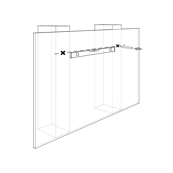Step 2. Repeat for each additional bracket by measuring the horizontal spacing from your first pencil mark. Place a level on the first screw hole to find the position of the second one. Mark the position of the second screw hole with a pencil. (¹)