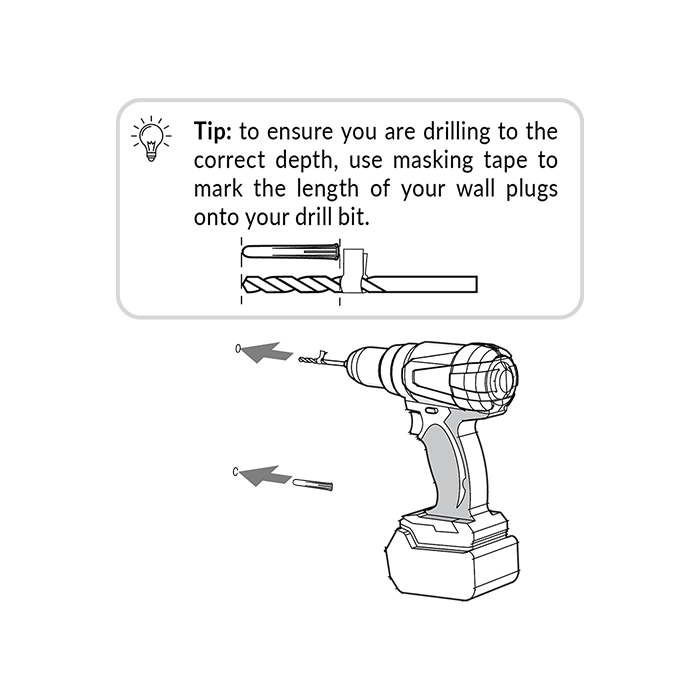 Step 4. If installing directly onto a wall stud or blocking, skip this step. If not, you will require wall plugs. Wearing eye protection, drill all screw locations with an 8mm drill bit. Once the holes have been drilled, install wall plugs by placing them into the holes you have drilled and push/tap them into the wall until flush.