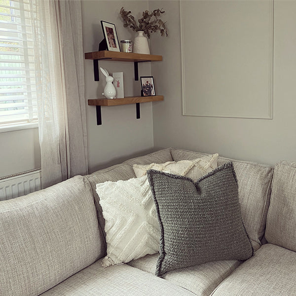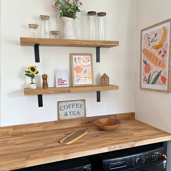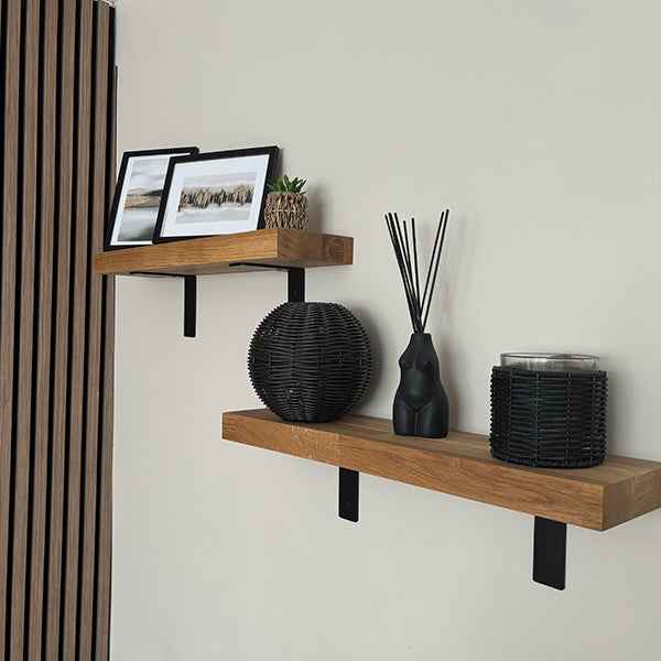 Our solid wood wall shelves will make a beautiful addition to any space. Each solid oak wall shelf is hand-crafted and individually manufactured to the highest standard from sustainably sourced European oak. Modern, flat-style scaffolding brackets perfectly complement the solid oak wood shelf with a sophisticated, powder-coated black finish.