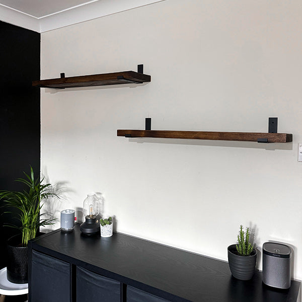 Our solid wood wall shelves will make a beautiful addition to any space. Each tudor oak pine rustic shelf is hand-crafted and individually manufactured to the highest standard from sustainably sourced European pine. Sleek, up-style scaffolding brackets perfectly complement the solid pine wood shelf with a sophisticated, powder-coated black finish.