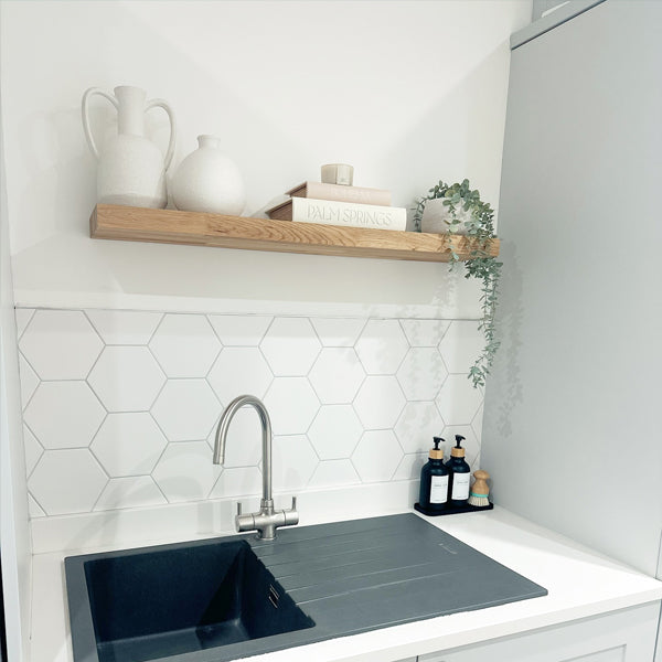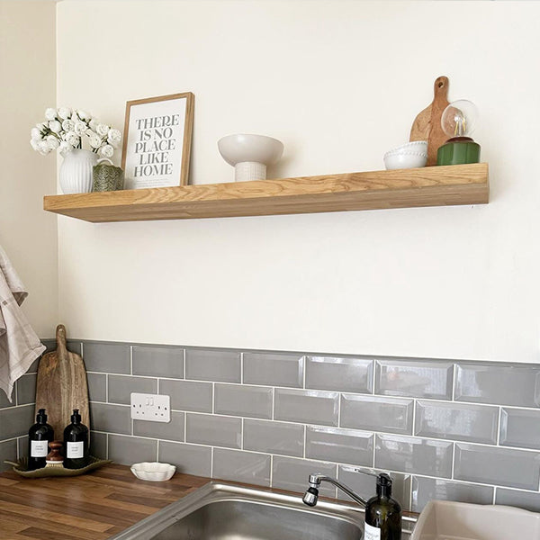 With a prominent grain and striking natural features, our range of oak floating shelves is hand-finished and then oiled - creating a beautiful golden hue.