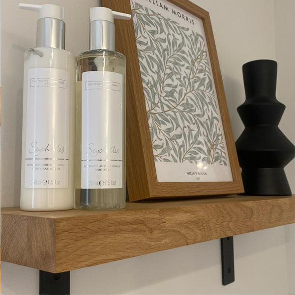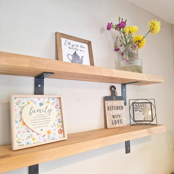 Our solid wood wall shelves will make a beautiful addition to any space. Each solid oak wall shelf is hand-crafted and individually manufactured to the highest standard from sustainably sourced European oak. Modern, flat-style scaffolding brackets perfectly complement the solid oak wood shelf with a sophisticated, powder-coated black finish.